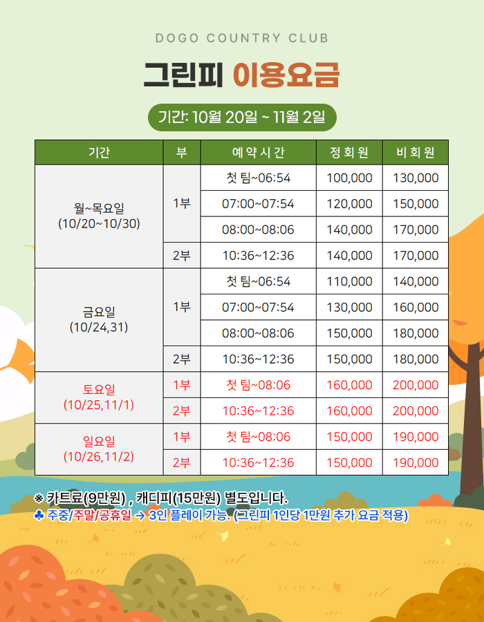 10월 20일 ~ 11월 2일 그린피 이용요금 | 25-10-10 |